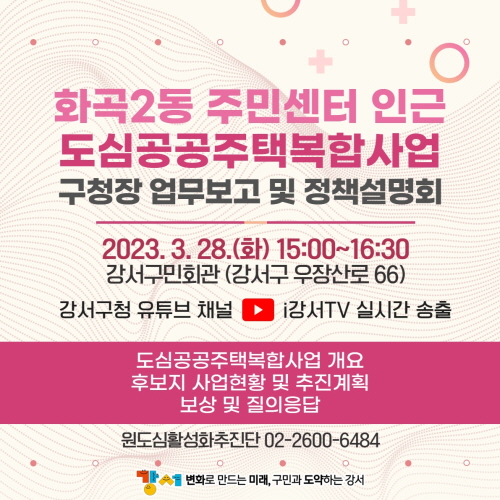 서울 강서구가 오는 28일 오후 3시 강서구민회관 우장홀에서 600여 명의 주민과 함께 '도심공공주택복합사업 정책설명회'를 개최하며 사업 추진 속도를 높인다.