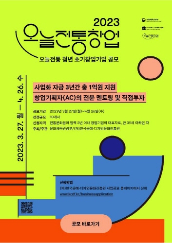 문화체육관광부(이하 문체부)와 한국공예·디자인문화진흥원(이하 공진원)은 3월 27일부터 4월 26일까지 '오늘전통'을 만들어 갈 청년 창업기업 10개 사를 공개 모집한다.