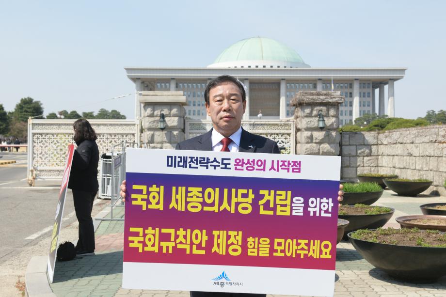 최민호 세종특별자치시장이 27일 서울 여의도 국회 본원 앞에서 국회 세종의사당 건립을 위한 국회규칙안의 조속한 제정을 촉구하는 1인 시위를 강행했다.