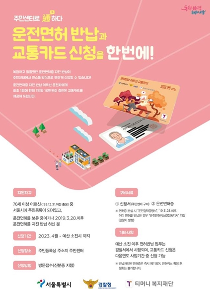 서울시는'고령 운전자 면허 자진반납 간소화 서비스'를 통해 어르신들의 면허 반납과 교통카드 수령 과정을 더욱 편리하게 지원하고 있다. 면허 반납을 원하는 어르신은 주민센터에서 면허 반납 신청부터 교통카드 수령까지 한 번에 가능하다.