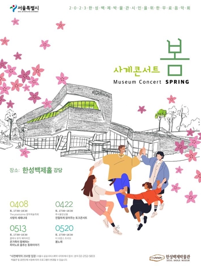 한성백제박물관은 문화예술단체의 재능기부 공연인 ‘한성백제박물관 사계콘서트 봄’을 개최한다. 사계콘서트는 지난 2016년부터 이어 온 시민을 위한 무료 음악행사로 박물관 대표 문화행사이다. 매년 봄, 여름, 가을, 겨울 사계절에 맞추어 다양한 장르로 시민들에게 아름다운 선율과 감동을 선사하고 있다.