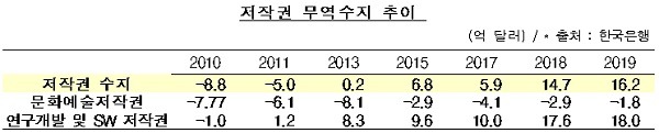 지난 24일 한국은행이 발표한 ‘2019년 중 지식재산권 무역수지(잠정)’에 따르면 2019년도 우리나라 지식재산권 무역수지는 총 8억 달러의 적자를 기록했지만, 저작권 무역수지는 16억 2000만 달러 흑자를 나타냈다.