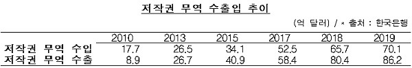 한편, 한국은행이 그간 발표한 자료를 종합해 보면 지난 10년간 우리나라의 저작권 수입은 2010년 총 17억 7000만 달러에서 2019년 총 70억 1000만 달러로 약 3배가 증가한 반면, 저작권 수출은 같은 기간 동안 총 8억 9000만 달러에서 86억 2000만 달러로 약 8.6배나 증가한 것을 알 수 있다.