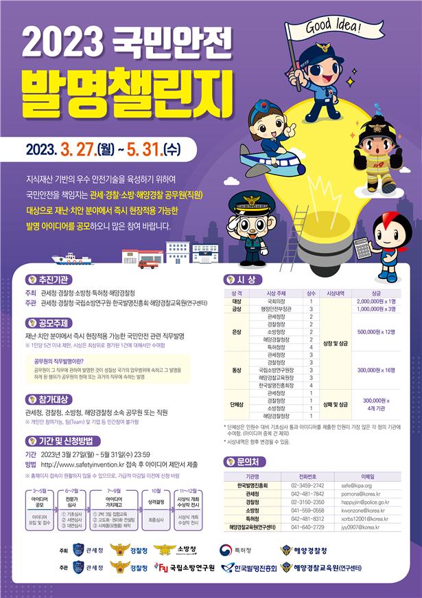 해양경찰청은 관세청, 경찰청, 소방청, 특허청과 공동으로 「2023 국민 안전 발명 챌린지」아이디어 접수를 3월 27일(월)부터 5월 31일(수)까지 진행한다.