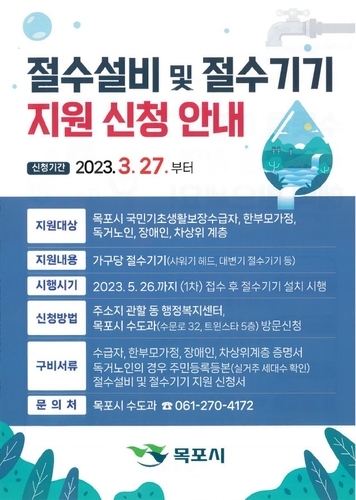 목포시는 국민기초생활보장 수급자, 한부모가정, 독거노인, 장애인, 차상위계층 가구를 대상으로 절수설비 및 절수기기(샤워기 헤드, 대변기 절수기 등)를 지원한다.