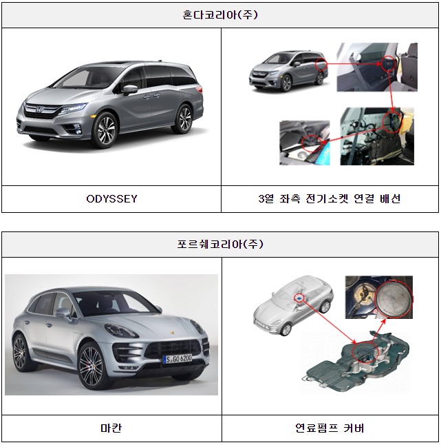 다섯째, 혼다코리아㈜에서 수입, 판매한 ODYSSEY 2,424대는 조립과정에서 3열 좌측 전기소켓(시거잭)의 연결배선이 특정 부품에 눌려 배선 피복이 벗겨지고, 이로 인해 화재가 발생할 가능성이 확인되어 시정조치(리콜)에 들어간다.