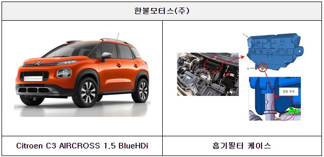 일곱째, 한불모터스㈜에서 수입, 판매(판매이전 포함)한 Citroen C3 AIRCROSS 1.5 BlueHDi 등 10개 차종 700대는 흡기필터 케이스와 냉각수 호스와의 간섭으로 호스가 손상되고 이로 인해 엔진이 과열될 가능성이 확인되어 시정조치(리콜)에 들어간다.