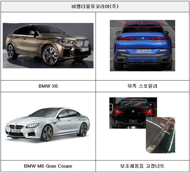 마지막으로, 비엠더블유코리아㈜에서 수입, 판매한 X6 xDrive30d 등 3개 차종 205대는 차량 뒤쪽 스포일러의 고정 결함으로, M6 Gran Coupe 97대는 보조 제동등 고정너트의 결함으로 주행 중 해당 부품이 이탈되어 뒤따라오는 차량의 안전운행에 지장을 줄 가능성이 확인되어 시정조치(리콜)에 들어간다.