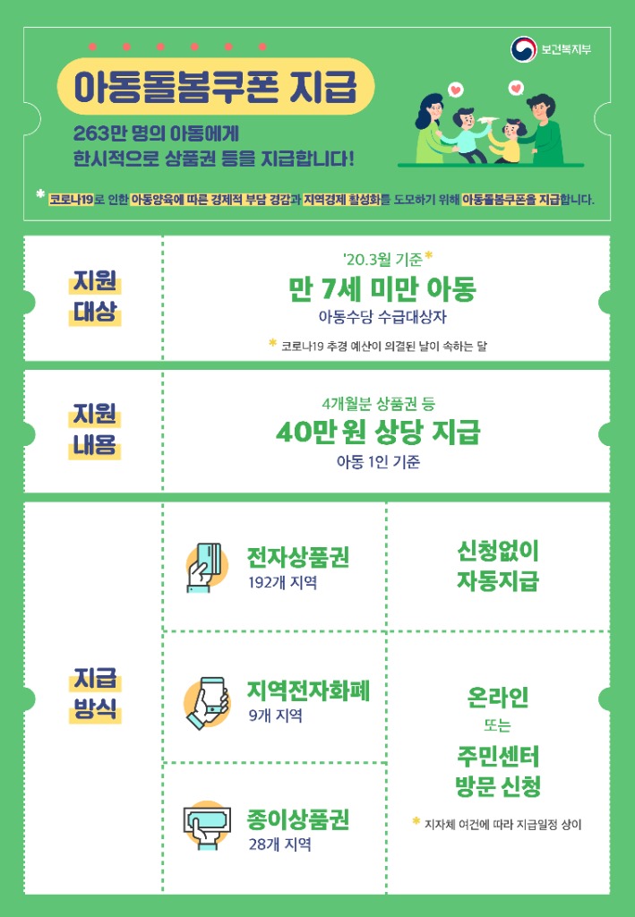 아동돌봄쿠폰은 아동수당을 지급받는 만 7세 미만의 자녀를 둔 가구에 아동 1인당 40만 원 상당의 상품권 등을 국비로 긴급지원하는 사업으로. 지난 3월 17일 국회에서 통과된 코로나19 대응 추가경정예산에 반영되었다. (1조539억 원)