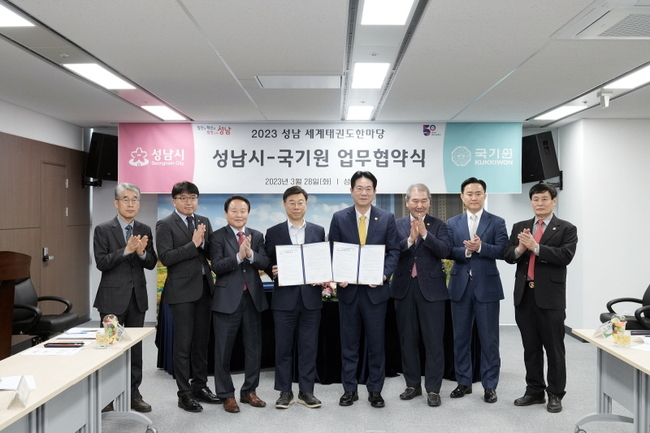 60 개국 1 만 명 참여 규모의 세계태권도 한마당을 유치한 성남시가 성공적인 대회 개최를 위해 3 월 28 일 국기원과 공동 협약을 체결했다 .