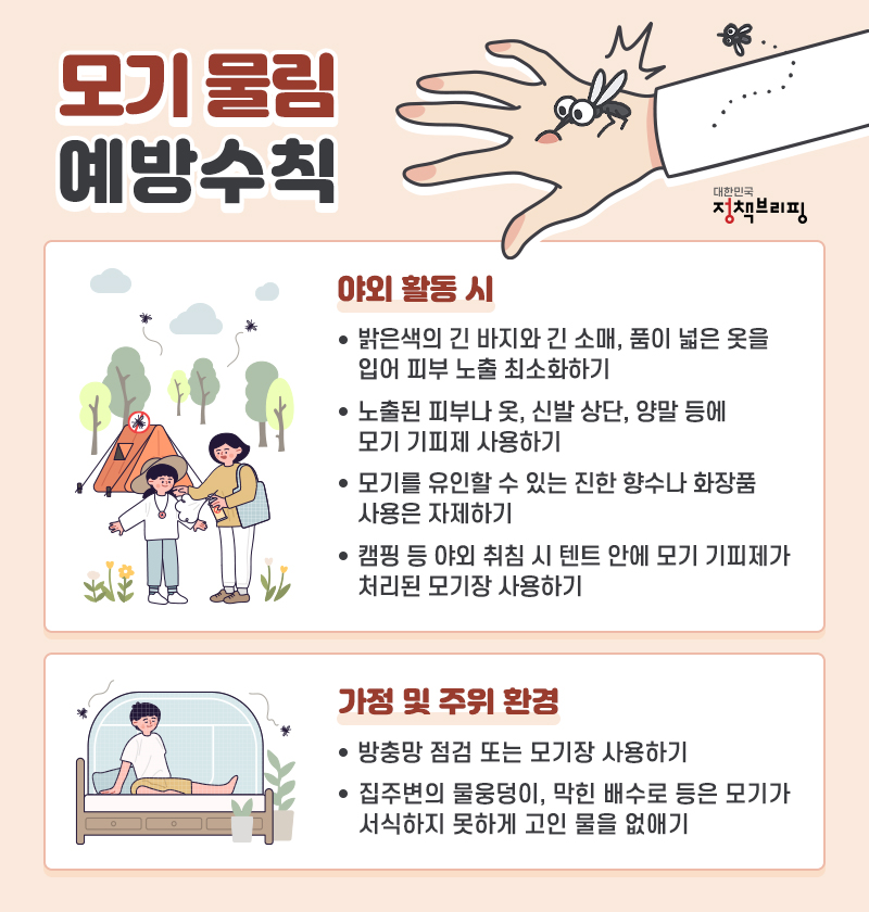 ‘일본뇌염’은 무엇보다 모기에 물리지 않는 것이 중요하므로 모기가 활동하는 기간에 지속적으로 모기 물림 예방수칙 준수가 필요하다. 구체적인 수칙은 다음과 같다.