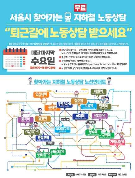 서울시가 매주 마지막주 수요일 직장인들의 퇴근 시간에 맞춰 서울 시내 22개 주요 지하철 역사에서 ‘찾아가는 무료노동상담’을 진행한다고 밝혔다. 오는 3월 29일 첫 상담을 시작해 11월 말까지 상담이 진행된다.