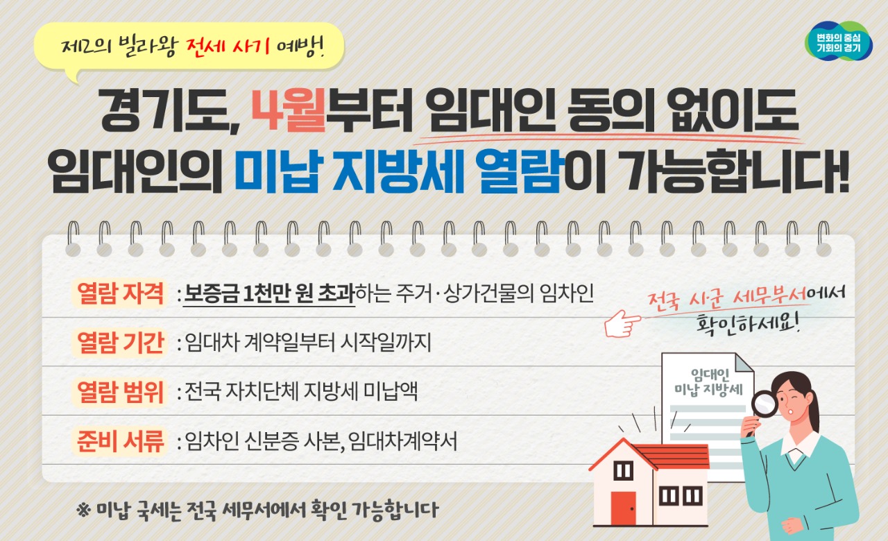 경기도가 최근 사회문제가 되는 전·월세 사기를 예방하기 위해 임차인이 임대인 동의 없이도 임대인의 미납 지방세를 열람할 수 있도록 한다.