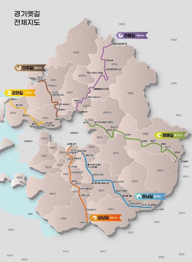 2013년 삼남길(과천~평택·98.5㎞)과 의주길(고양~파주·60.9㎞)을 복원했으며, 2015년 영남길(성남~이천·116㎞), 2020년 평해길(구리~양평·133.2㎞), 2021년 경흥길(의정부~포천‧88.8㎞), 2022년 10월 15일 강화길(아라김포여객터미널~강화대교·52㎞)을 차례로 복원했다.