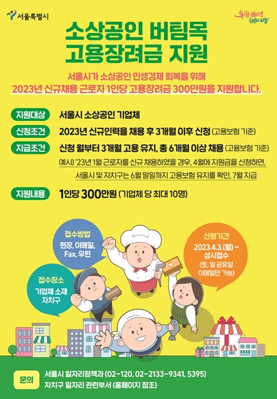 '소상공인 버팀목 고용장려금'사업은 서울지역 소상공인이 ‘23년 신규인력을 채용할 경우 1인당 3백만원을 지급, 총 61억원의 예산을 투입하여 약 2천명의 신규채용 인건비를 지원한다.