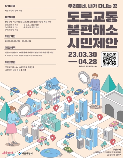 서울시가 창의행정 과제로 선정한 “시민생활 밀착형 도로교통 정체 및 사고우려 도로지점에 대한 개선”을 본격 추진하고자 다양한 시민의견을 3월 30일부터 4월 28일까지 약 한 달간 접수한다고 밝혔다.