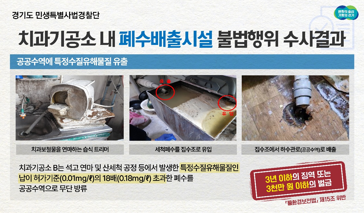 특사경은 주조체 산세척과정에서 중금속이 발생한다는 치과기공소의 2018년 학술자료에 근거해 2022년부터 정보수집에 들어갔다. 이어 지난해 지식산업센터 내 폐수배출시설 불법행위 수사에서 치과기공소 2개소의 폐수에서 납과 안티몬 등 특정 수질수해 물질이 허가기준 이상 검출됨을 확인했다. 이에 경기도 전체로 수사 범위를 확대해 이번 수사를 실시했다.