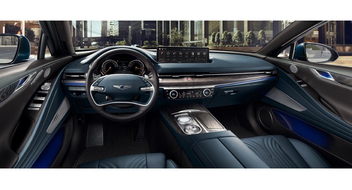 제네시스 통합 컨트롤러와 연동해 편의성을 높인 14.5인치 인포테인먼트 시스템은 ▲증강현실 내비게이션 ▲제네시스 퀵가이드 ▲제네시스 카페이 ▲발레 모드 등을 지원한다.