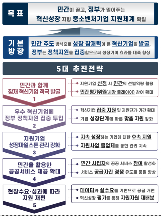 중기부는 이번 방안에서 ‘민간이 끌고 정부가 밀어주는 혁신성장 지향 중소벤처기업 지원 체계 확립’을 목표로 5대 정책방향을 설정했다.