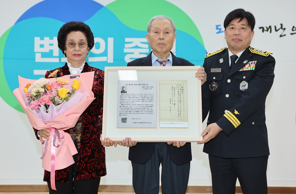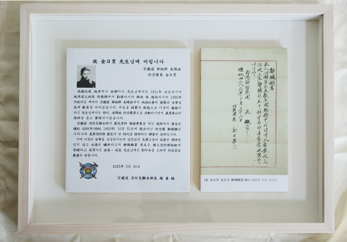 경기도 소방재난본부는 지난 30일 본부 청사 3층 대회의실에서 고(故) 김일남 방공단원의 장남인 김영일(83) 선생에게 고인의 사직원서 영인본을 전달했다.