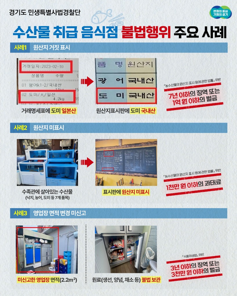 경기도 민생특별사법경찰단은 지난 2월 27일부터 3월 10일까지 도내 수입 수산물 취급 음식점 360곳을 단속한 결과 55개소를 적발했다고 3일 밝혔다.