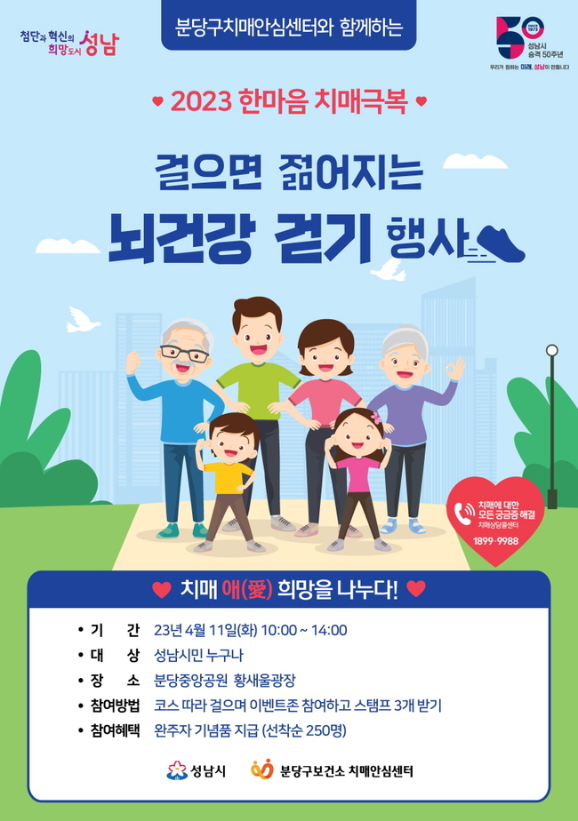 성남시는 오는 4 월 11 일 오전 10 시부터 오후 2 시까지 분당 중앙공원에서 ‘ 한마음 치매 극복 , 걸으면 젊어지는 뇌 건강 걷기 ’ 행사를 연다 .
