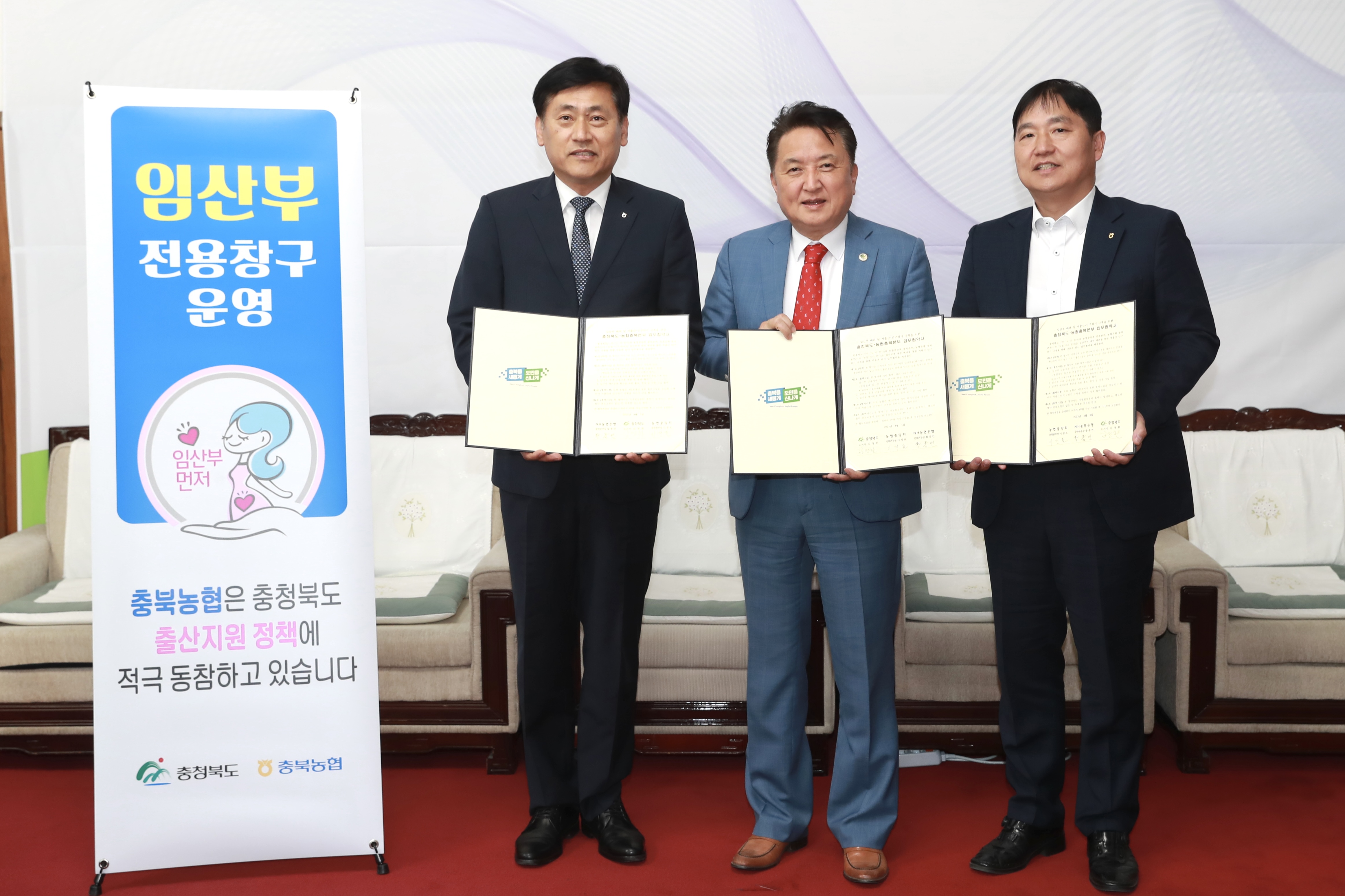 이날 협약에는 김영환 충북도지사와 이정표 농협중앙회 충북본부장, 황종연 농협은행 충북본부장이 참여하여 협약서에 서명했으며, 협약 내용에 따라 지역사회 모든 분야에서 임산부를 우대하는 문화를 확산하여 ‘아이 낳고 기르기 좋은 1등도 충북’을 만드는 데 적극 동참하기로 했다.