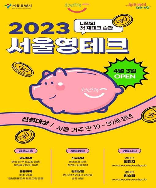 서울시가 4월 3일 오전 9시부터 2023년 서울 영테크 재무상담 참여자 1만 명을 모집한다. 자산 형성을 위한 맞춤형 재무 상담을 받고 싶은 만 19~39세 서울 거주 청년 누구나 청년 몽땅 정보통에서 신청할 수 있다.