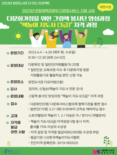 또한, 다문화가정 독서교육 지원을 위한 시민 독서자원활동가 양성을 위해 “그림책 봉사단 양성과정 책놀이 지도사(3급)”자격증 과정을 신설했다. 이밖에도 결혼이주여성 강사가 학교 및 유치원으로 찾아가는 다문화 이해교육과 인형극 및 도서관 견학 프로그램도 진행할 계획이다.