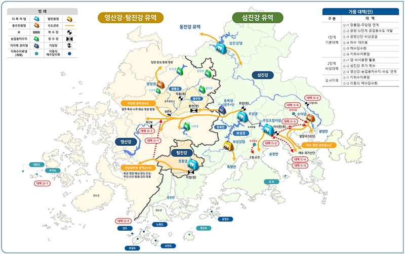 ‘1단계 기본대책’은 영산강·섬진강 유역 댐(주암댐·수어댐·섬진강댐·평림댐·장흥댐·동복댐)별로 과거에 발생했던 가장 큰 가뭄이 동시에 발생할 것을 가정해 생활·공업 용수가 안정적으로 공급되도록 하루 45만톤의 용수를 추가로 확보하는 것을 목표로 한다.