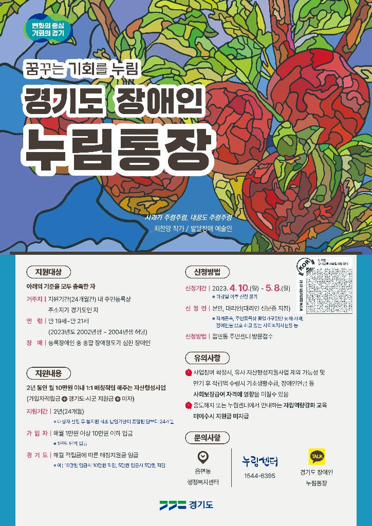 한편 이번 누림통장 홍보 포스터에 삽화를 제공한 발달장애인 미술가인 최찬양 작가는 ‘경기도 누림통장’이 매월 적은 금액이라도 저축을 통해 꿈도 키워가는 기회가 될 수 있다는 의미에서 작품명을 ‘사과가 주렁주렁, 내 꿈도 주렁주렁’으로 정했다고 전했다.