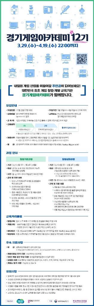 경기도는 게임 창업 또는 개발 전문 교육 프로그램 ‘경기게임아카데미 창업 과정’ 12기 수강생을 오는 19일까지 모집한다.