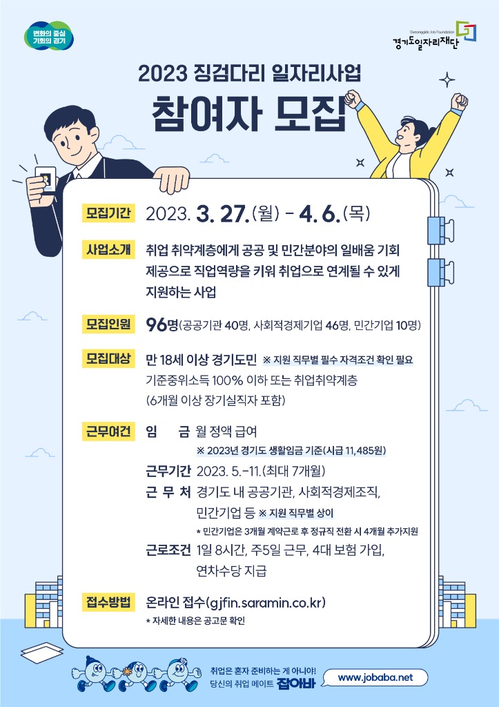 경기도와 경기도일자리재단은 취업 취약계층 등을 위한 경력 형성형 일자리 창출 지원사업인 ‘2023년 징검다리 일자리 사업’에 참여할 구직자를 모집한다.