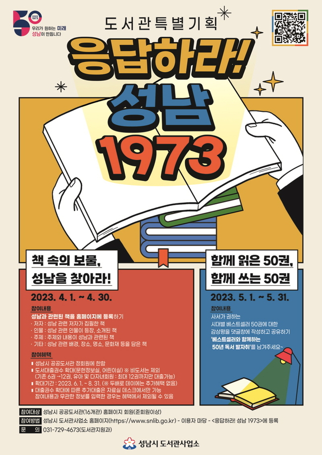 ‘ 책 속의 보물 성남을 찾아라 (4.1~30)’, ‘ 함께 읽은 50 권 , 함께 쓰는 50 권 (5.1~31)’ 등 2 개 행사가 성남시 도서관사업소 홈페이지 ( 이용자 마당 → 응답하라 ! 성남 1973) 를 통해 진행된다 .