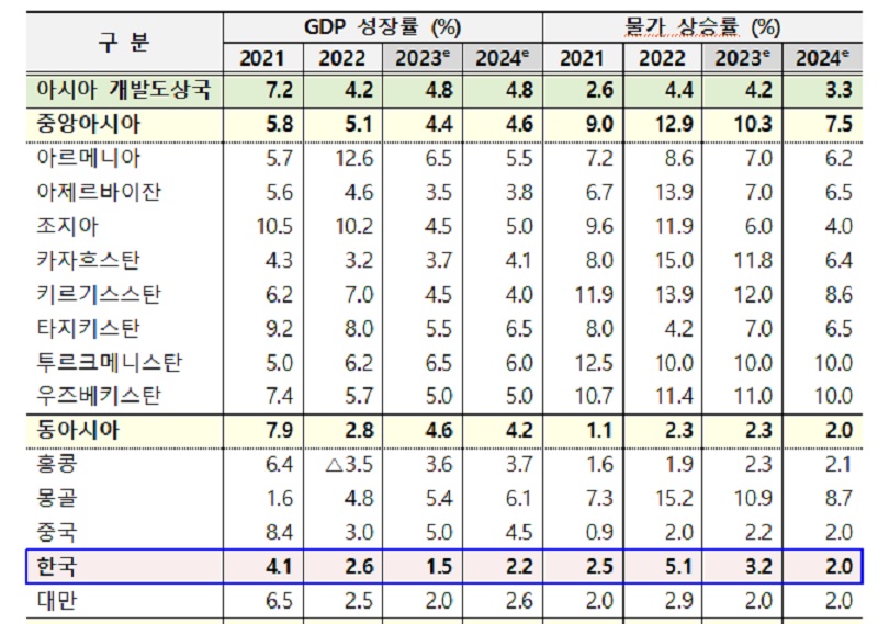 ADB는 “중국의 급격한 리오프닝(경제 활동 재개)이 향후 아시아 지역 성장률 상방 요인”이라면서도 “고부채·고금리로 인한 금융 부문 불안정성, 우크라이나 사태로 인한 상품가격 재급등과 이에 따른 물가 상승, 통화 긴축 가능성 등 도전 요인이 여전히 남아있다”고 지적했다.