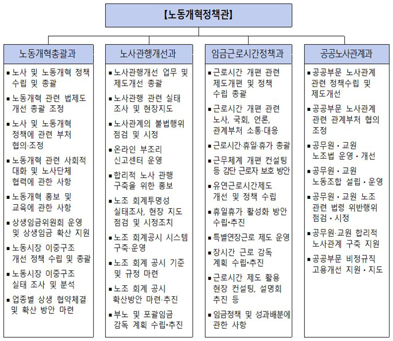 노동개혁정책관은 부처 내 각각 진행하던 노사 법치주의, 노동규범의 현대화, 이중구조 해소 등 노동개혁 과제들을 통일된 전략 아래 일관성 있고 속도감 있게 추진한다.
