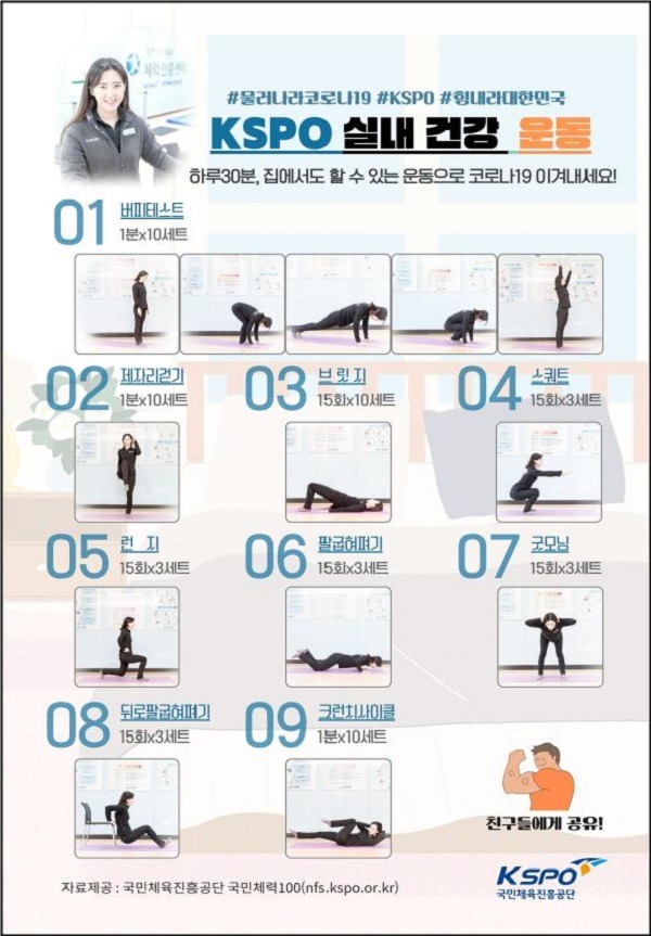 이번 캠페인에서는 집 안에서 할 수 있는 간단한 운동 방법과 운동 수칙을 안내하고 전문가의 운동 상담을 제공하며, 집콕운동을 주제로 한 영상 공모전도 함께 진행한다.