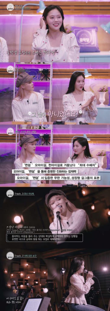 두 사람은 등장부터 활력 넘치는 '꺄르르' 웃음과 시원한 리액션으로 '리액션 부자'의 면모를 보였다. MC 김이나는 "보기만 해도 행복해지는 소녀들. 홍삼, 자양강장제 같다"고 칭찬했고, MC 배순탁도 "왜 비타민, 엔도르핀이라고 하는지 단번에 알겠다"며 감탄했다.