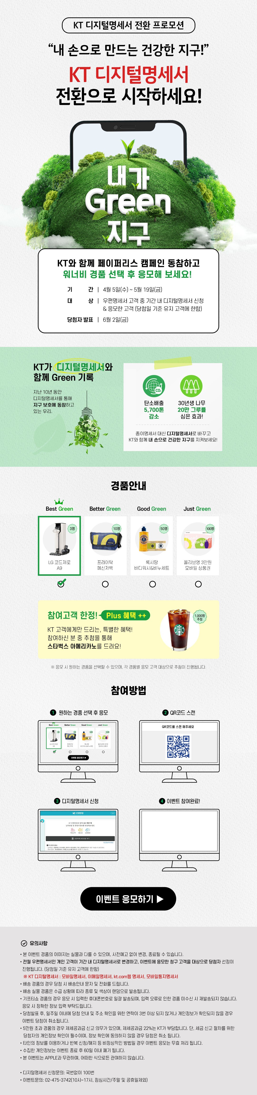 KT(www.kt.com)는 식목일을 맞이해 우편 명세서를 이용하는 KT 고객이 5월 19일까지 모바일명세서, 이메일명세서, kt.com웹명세서, 모바일통지명세서 등의 디지털명세서로 전환하고 KT홈페이지(https://kt.com/o2lx)에 응모하면 다양한 경품을 제공하는 이벤트를 연다고 5일 밝혔다.