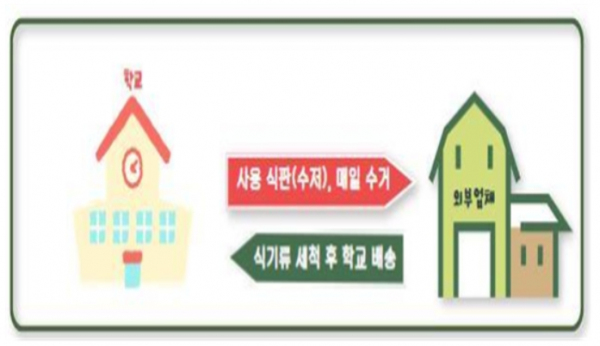 식기류 렌탈·세척 서비스는 학교가 급식에 필요한 식판과 수저 세트를 외부 전문업체에 빌려 사용하면, 외부업체는 사용한 식기를 매일 수거한 후 세척·살균하여 다시 학교로 배송하는 방법으로 운영된다.