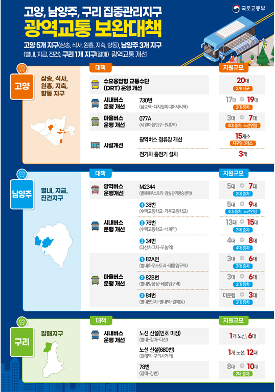 국토교통부 대도시권광역교통위원회는 고양 5개 지구(삼송·식사·원흥·지축·향동)와 남양주 3개 지구(별내·지금·진건), 구리 갈매지구 등 9개 집중관리지구의 광역교통 단기보완 대책을 5일 발표했다.