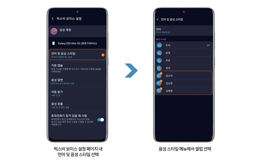 설정 방법도 간단하다. ‘빅스비’ 설정 페이지에 들어가 ‘언어 및 음성 스타일’ 섹션을 누르면, 음성 스타일 메뉴에서 셀럽의 목소리를 직접 선택할 수 있다. 현재 갤럭시 스마트폰과 스피커에서 사용할 수 있으며, 추후 전체적인 삼성 모바일 제품군과 TV 등 빅스비를 이용할 수 있는 모든 기기에 서비스를 확대해 나갈 예정이다.