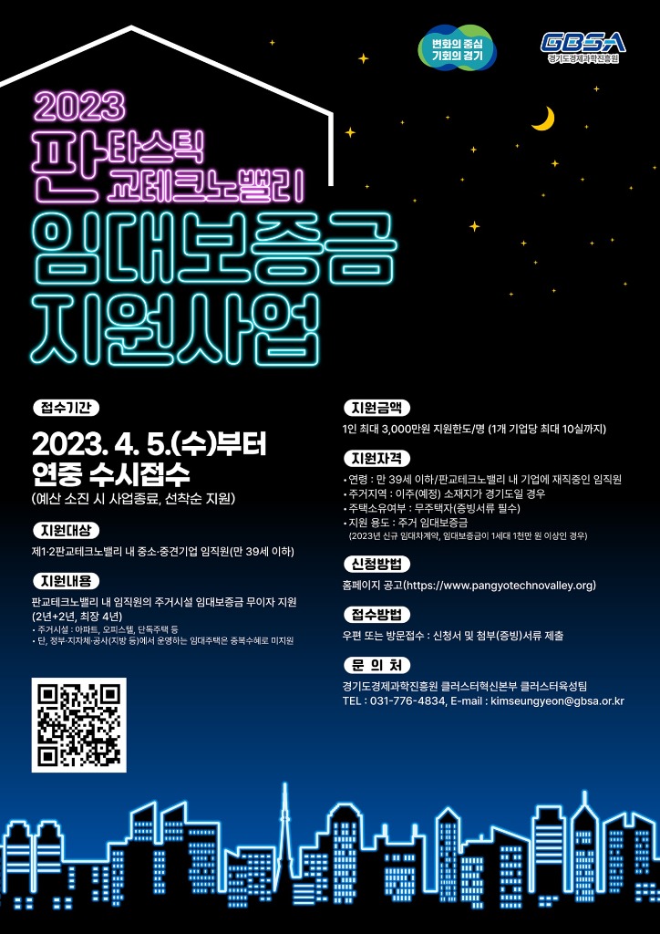 경기도와 경기도경제과학진흥원은 판교테크노밸리에서 근무하는 20~30대 근로자의 주거 안정과 통근 시간 절감을 위해 최대 3천만 원을 지원하는 ‘2023년 판교테크노밸리 임대보증금 지원사업’을 추진한다.