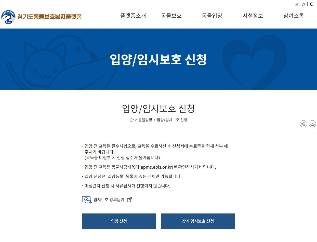 임시보호제 참여를 위해서는 반드시 경기도평생학습포털(Gseek.kr)에서 “구조, 보호동물 임시 보호 교육”(1시간)을 수료해야 한다. 온라인 교육 수료 후 마이페이지에서 수료증을 발급받을 수 있으며, 직영 동물보호센터(수원·용인·고양·시흥)에 전화 문의 후 참여 절차를 안내받아 수료증 사본, 임시보호 신청서 및 동의서를 제출하면 참여할 수 있다.