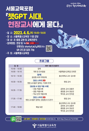 서울특별시교육청은 생성형 AI의 교육적 활용에 대한 현장의견 청취, 적용 사례 공유 및 발전방향 논의를 위해 4월 6일 서울시교육청 11층 강당에서 ‘챗GPT 시대, 현장교사에게 묻다.’를 주제로 서울교육포럼을 개최한다.