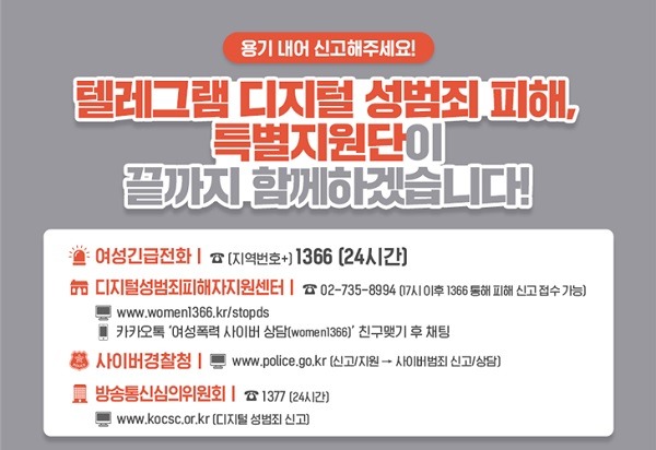 이에따라 디지털 성범죄 피해자가 24시간 운영하는 여성 긴급전화(1366)나 디지털 성범죄 피해자 지원센터(02-735-8994)로 피해지원 요청을 하면 특별지원단은 영상물 삭제, 심리치료, 상담·수사, 개인정보 변경 시 동행, 무료 법률지원 등 맞춤형 서비스를 제공한다.