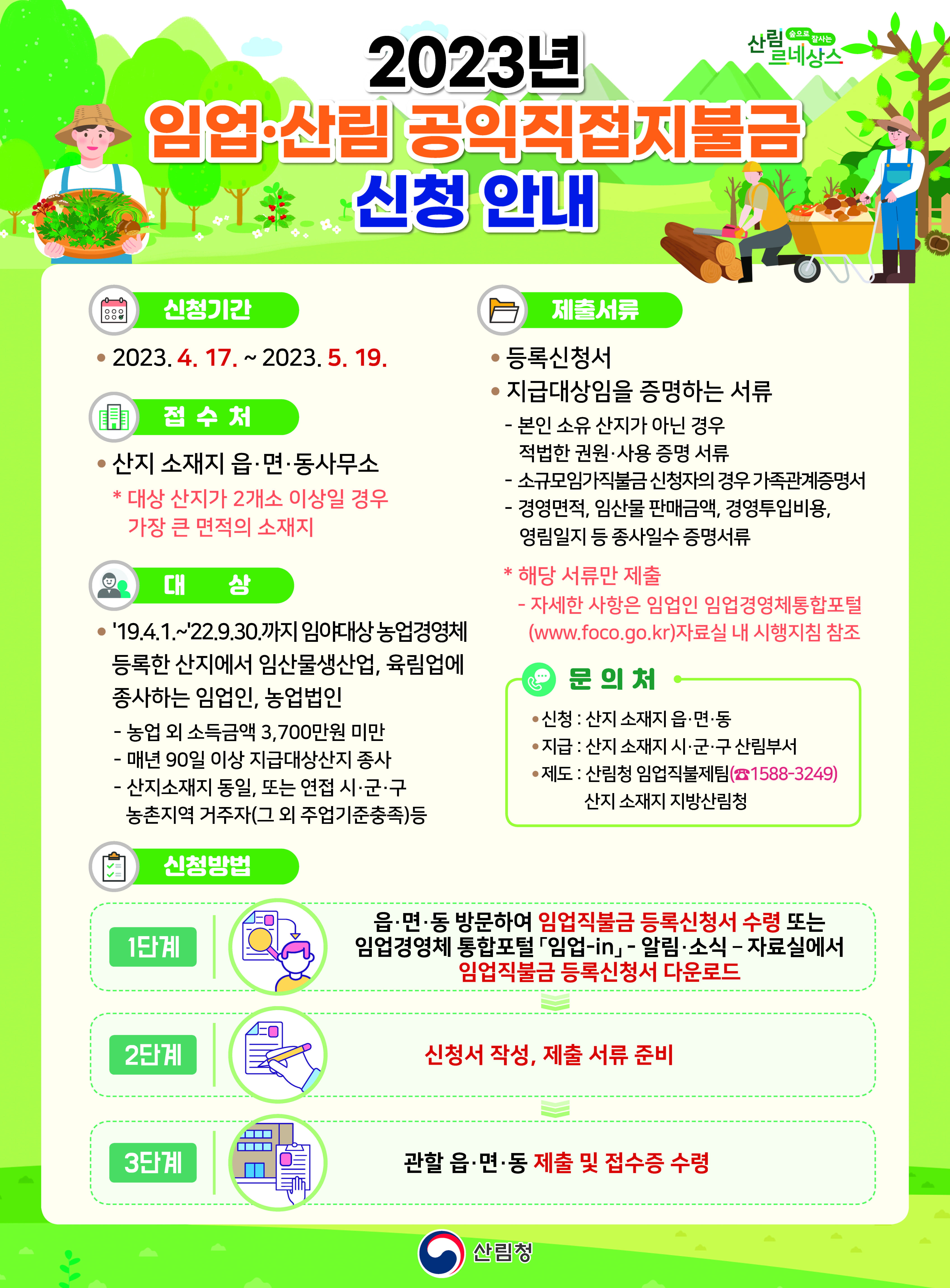 충북도는 4월 17일부터 5월 19일까지 2023년 임업ㆍ산림 공익직접지불금(이하 ‘임업직불금’)을 산지 소재지를 관할하는 읍ㆍ면ㆍ동사무소에서 신청받는다고 밝혔다.