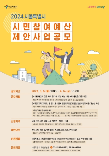 한편, 서울시는 시민이 직접 사회 문제 해결이나 시민 복리 증진을 위한 사업을 제안할 수 있도록 시민참여예산 사업 신청을 받고 있다. 접수기한은 4월 14일까지이며, 서울시민 누구나 서울시 시민참여예산 누리집에서 신청할 수 있다.