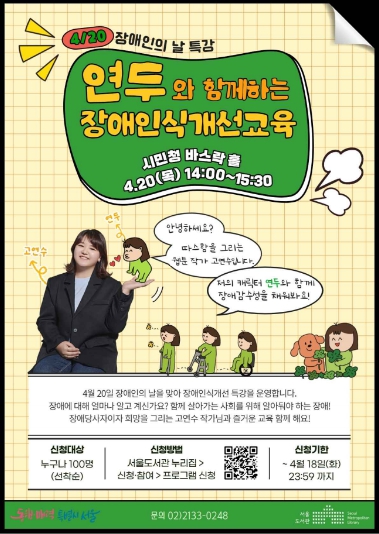 장애인의 날 기념 특강 '연두와 함께하는 장애인식개선'은 시민을 대상으로 4월 20일(목) 14:00~15:30 동안 시민청 지하 2층 바스락홀에서 무료로 진행한다.
