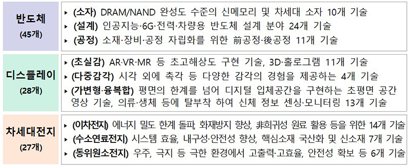 먼저 반도체는 소자, 설계, 공정 등 3개 분야에 총 45개, 디스플레이는 초실감, 차세대 프리폼(free-form), 융·복합 기술 확보 등을 위해 총 28개를 정했다.